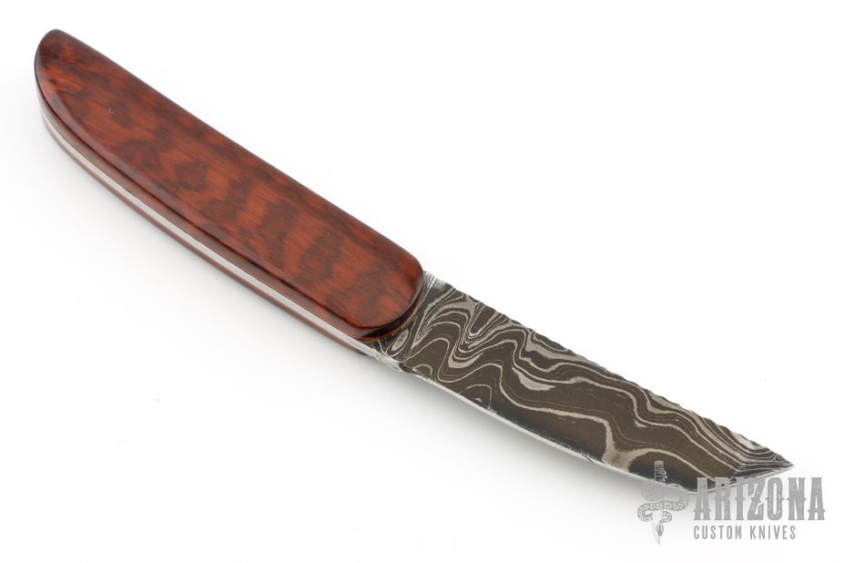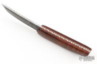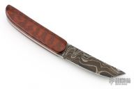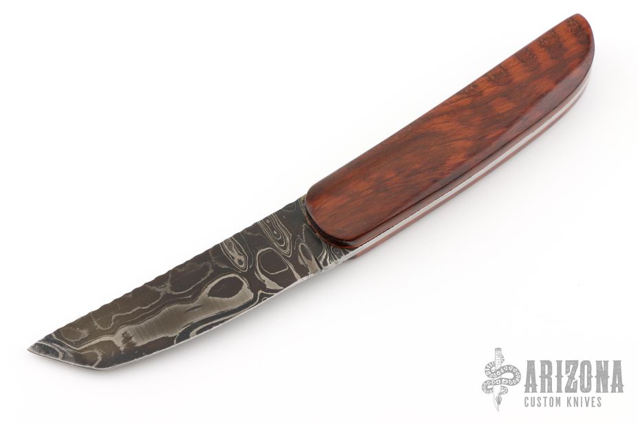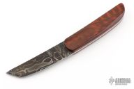 This Tanto features a Damascus tanto blade with a full tang construction, .105" blade stock and .72" blade depth. The handle has wood covers with orange liners. Has some scratches, otherwise excellent condition. File work by Ken Metsala.