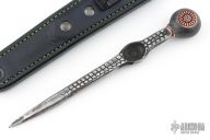 This Awl features a forged Death God pattern on the flats with forged patina finish. Leather sheath with Death God motif, finished with Ryan's homemade dye concoction.