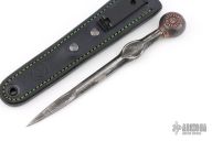 Hand forged by Ryan Johnson at the Gold Point Forge! Triangle profile shaft with forged motif and textured thumb rest. Copper end ball with Death God and the Gold Point logo stamped on either end. Hand stitched leather sheath with an IWB clip. Perfect for when you need to mark, pry or poke a hole in somthin'!