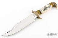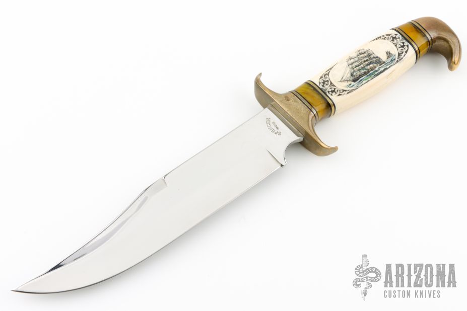 This Bowie by the Late Tiny Spencer features a mirror polished blade with false top edge, .187" blade stock and 1.583" blade depth, hidden tang construction. The handle has a brass guard and butt with a walrus ivory grip, black/brass/amber spacers. The handle has been scrimshawed by Yoko Gaydos. Has a couple light scratches and a crack in the ivory, otherwise excellent condition. Comes with a zippered case.