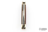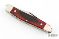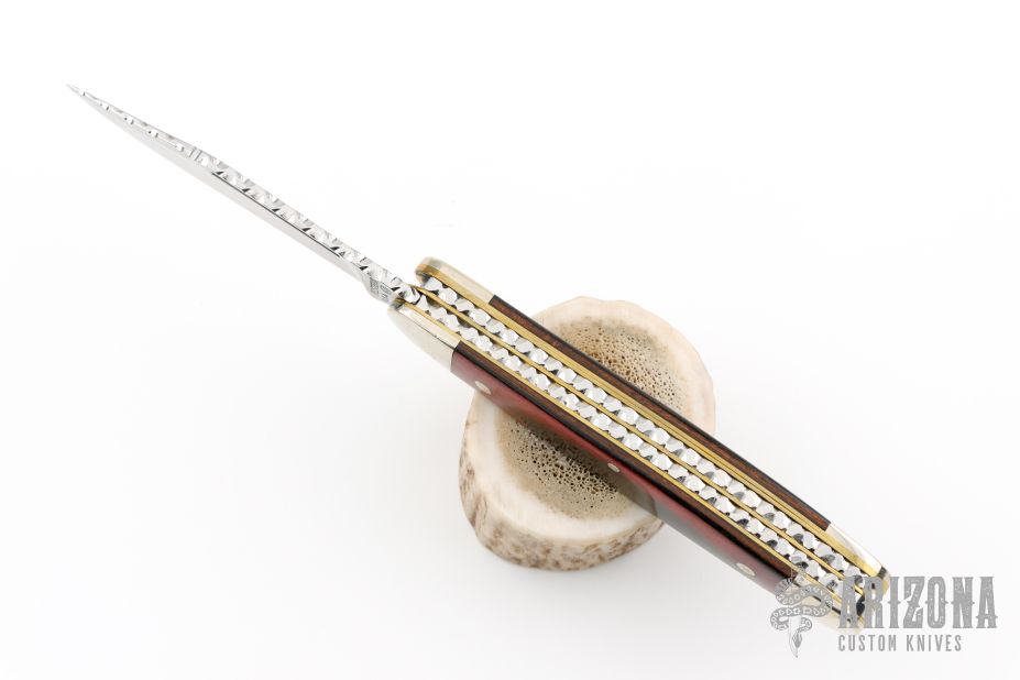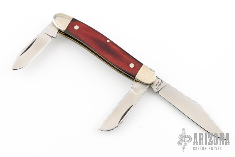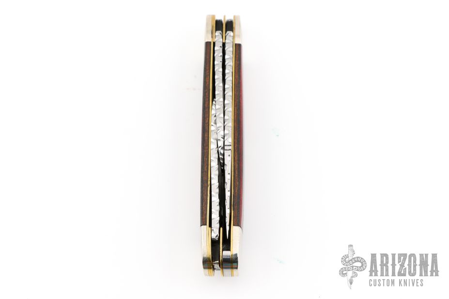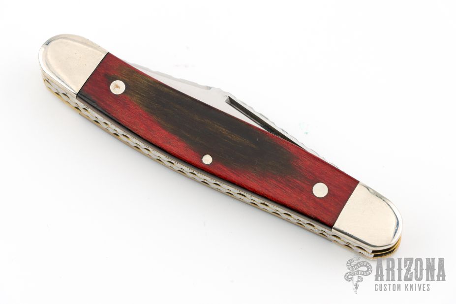 This stockman by Western Cutlery features satin finished blades with nail nicks and long pull. The handle has nickel silver bolsters, dymondwood covers, brass liners and stainless steel springs. Blade spines and springs are file worked by Ken Metsala. Has some light scuffs, excellent condition.