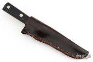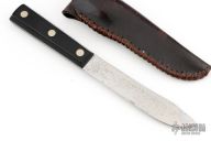 This vintage Case XX straight knife has a satin finished clip point blade, pinned wood handle with .092" bladestock, 1.094" blade depth with full tang construction. Comes with a leather belt sheath. Has scuffs, scratches, and patina, good condition for its age. Also has a dig in the handle near the tang.