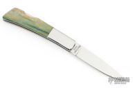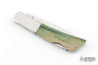 This Silver Knight by Gerber features a mirror polished blade with nail nick. The handle has stainless steel bolsters, mammoth scales, stainless steel liners, and a stainless steel backspacer. Has a couple light scuffs and scratches, excellent condition otherwise. File work on blade and rocker bar, as well as the scale replacement, by Ken Metsala.