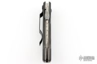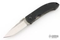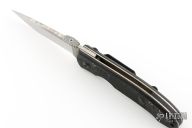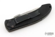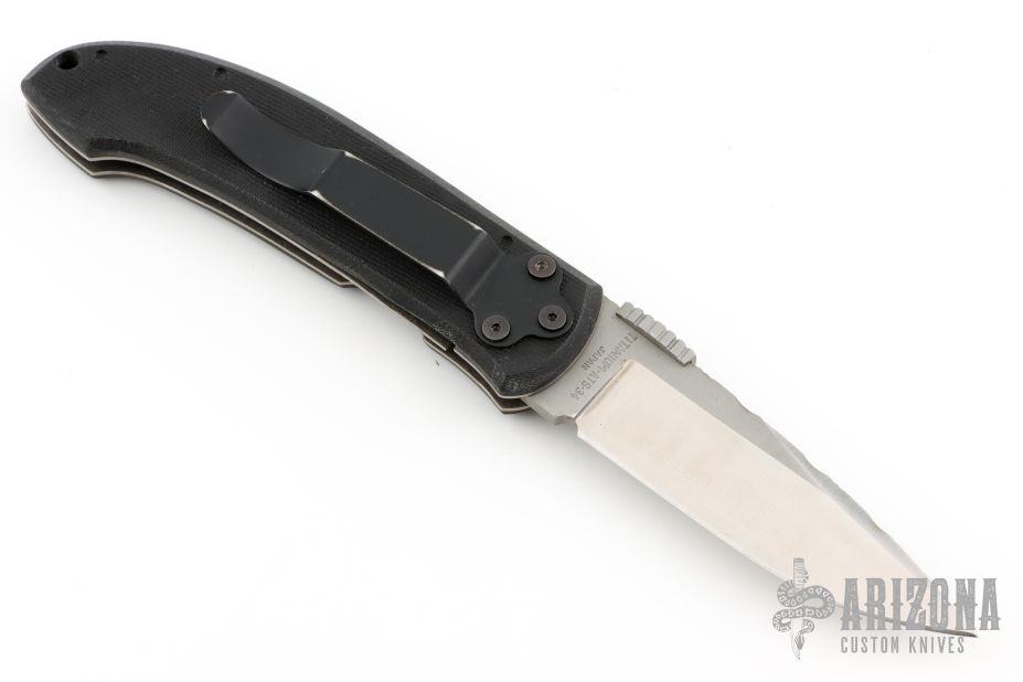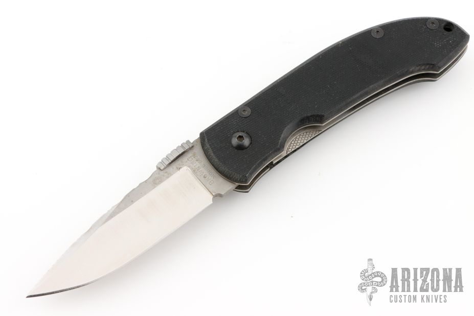 This knife by Browning features a satin finished blade with thumbdisc. The handle has textured G10 covers, titanium liners, and stainless steel tip down clip. Has some scuffs and scratches, as well as some spotting on the blade. Good condition. File work on the blade done by Ken Metsala.