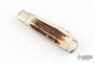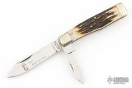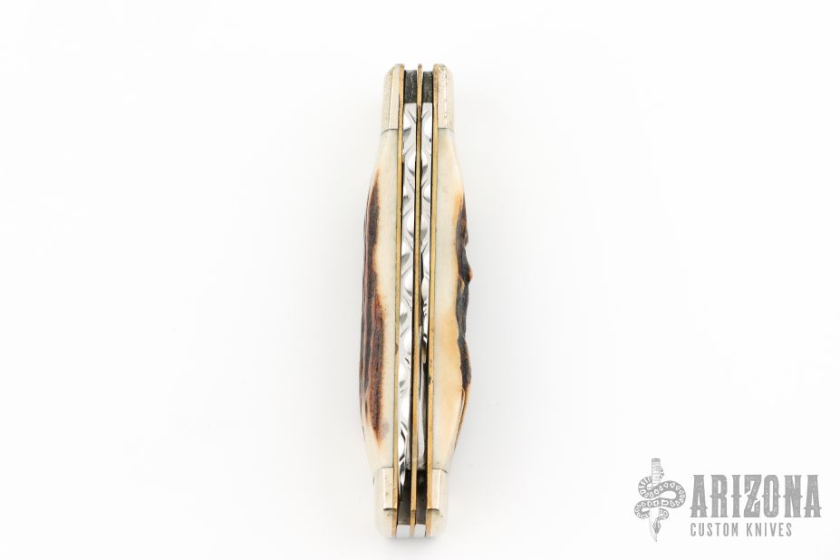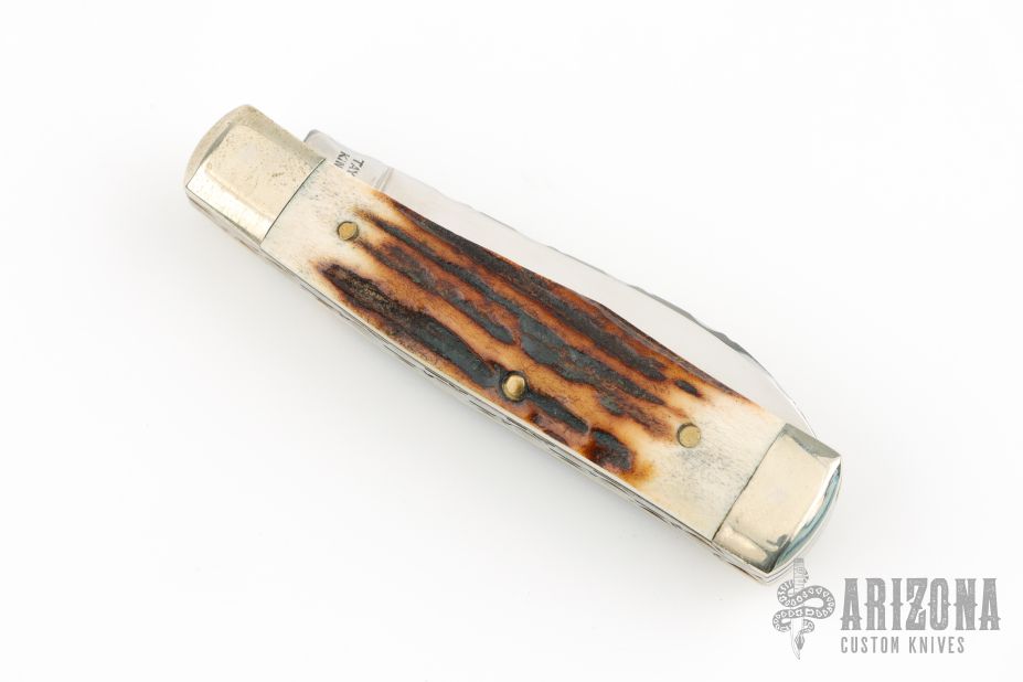 This knife by Taylor Cutlery features a mirror polished blades with nail nicks. The handle has nickel silver bolsters, stag covers, brass liners, steel springs. Has some light patina and scratches. Great condition otherwise. #587. Blades and Springs have been file worked by Ken Metsala.