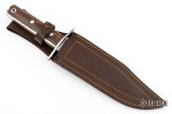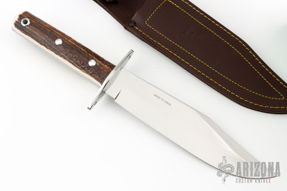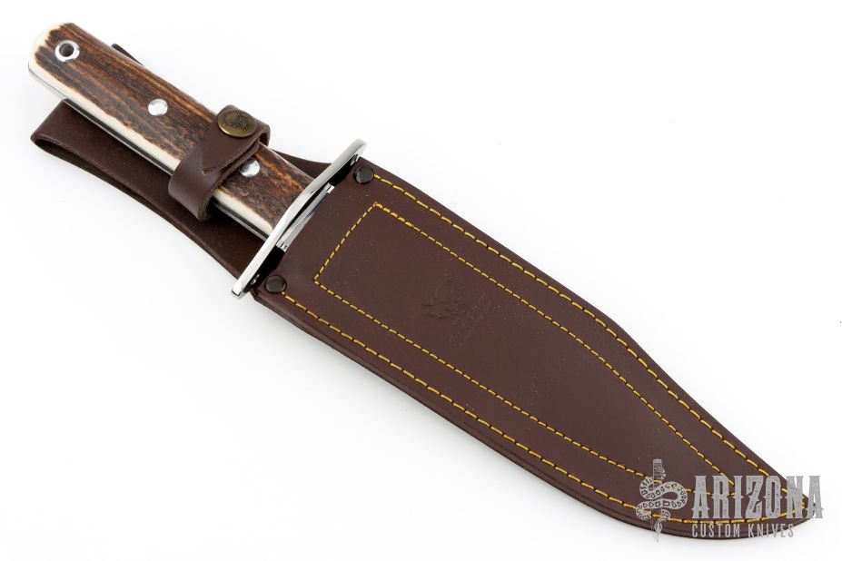 This Hand Made Bowie by Hen & Rooster Knives features a mirror finished blade with .181" blade stock and 1.745" blade depth, full  tang construction. The handle has a stainless steel guard and a stag scales. Comes with original box and brown leather sheath. Excellent condition.