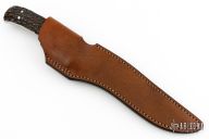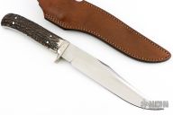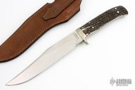 This knife by Perpina & Porcel features a satin finished clip point blade with false top edge, .195" blade stock and 1.405" blade depth, full tang construction. The handle has an engraved nickel silver guard, stag scales with nickel silver pins. Comes with a brown leather sheath and original box. Excellent condition.