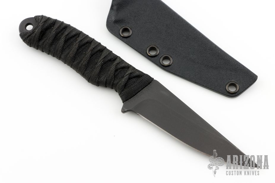 This Kidon by Joe Watson features a black coated blade, .130" blade stock and 1.130" blade depth, full tang construction. The handle has black cord wrap. Comes with a kydex sheath. Has a couple very light scuffs, otherwise excellent condition.