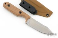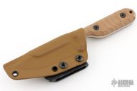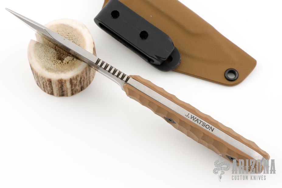 This Gamboa by Joe Watson features a stonewashed blade with notched thumbrest, .188" blade stock and 1.112" blade depth, full tang construction. The handle has sculpted brown G-10 scales. Comes with a kydex sheath. Excellent condition.