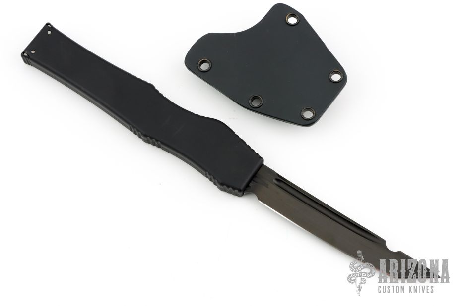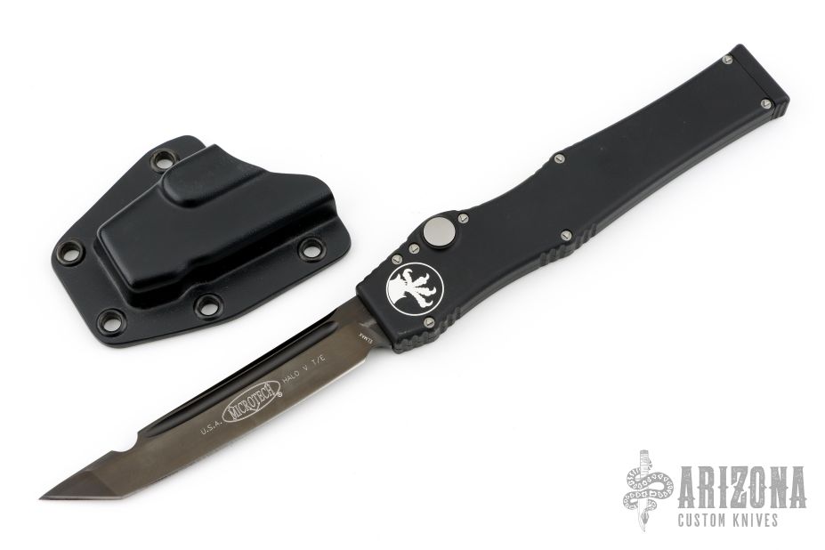 This Halo V OTF automatic has a black tanto blade with a standard edge and a black aluminum frame with blasted hardware. Dated 08/2014 and S/N 06934. Comes with original box, papers and sheath. Excellent condition.