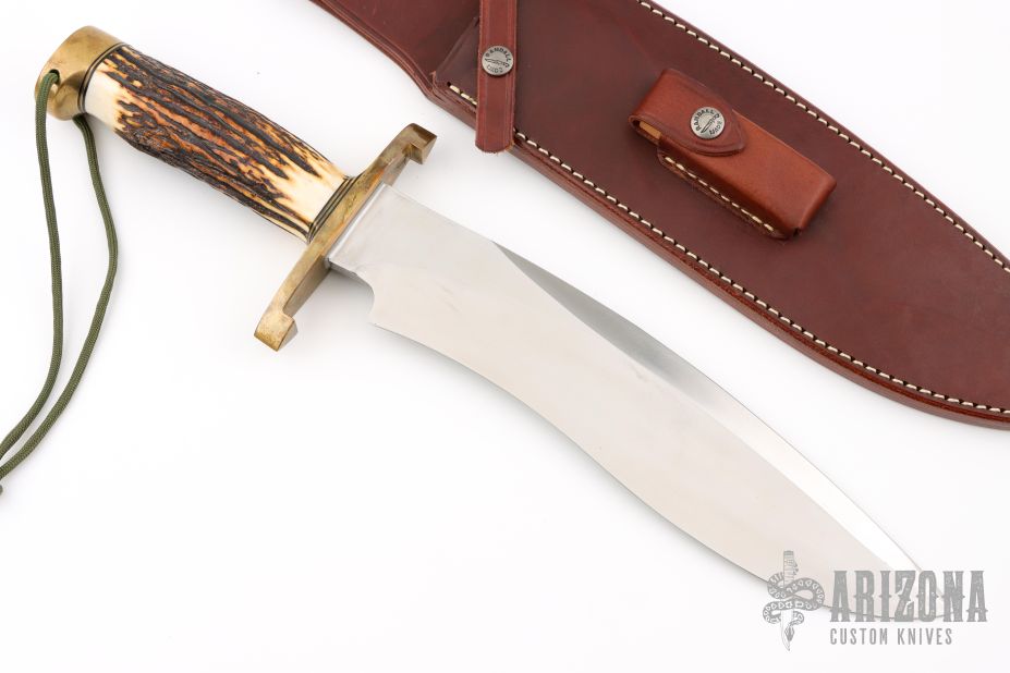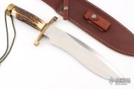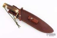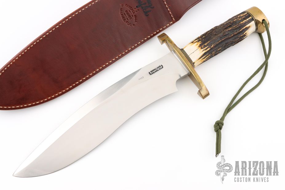 This Sasquatch by Randall Made Knives features a satin finished recurve blade with sharpened top edge, .336" blade stock and 2.225" blade depth, hidden tang construction. The handle has a lugged brass guard and butt with lanyard hole, stag grip with black/brass spacers. Comes with a brown leather sheath and a Randall zippered case. #469 on the blade. Excellent condition.