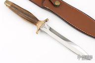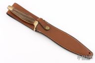 The Mark II is one of the best-selling knives of all time. First introduced in 1966, this tactical knife is serialized for collectors. This knife is Serial# 001639. It has a double edged mirror polished blade with .239" blade stock and .953" blade depth, hidden tang construction. The handle has brass guard and butt, wood grip and red/white spacers. Comes with original brown leather sheath. Has some light scratches and patina, otherwise excellent condition.
