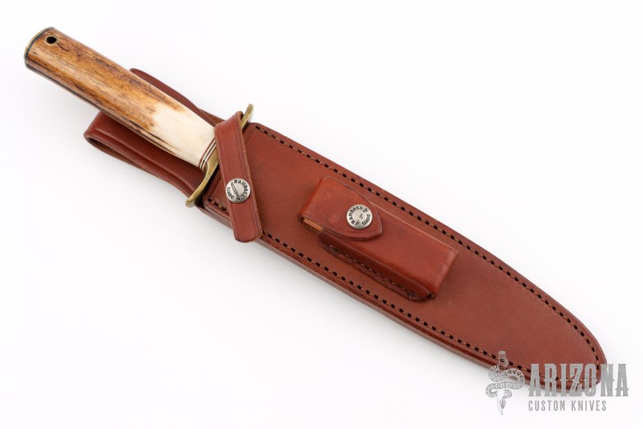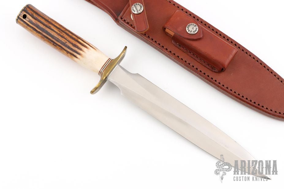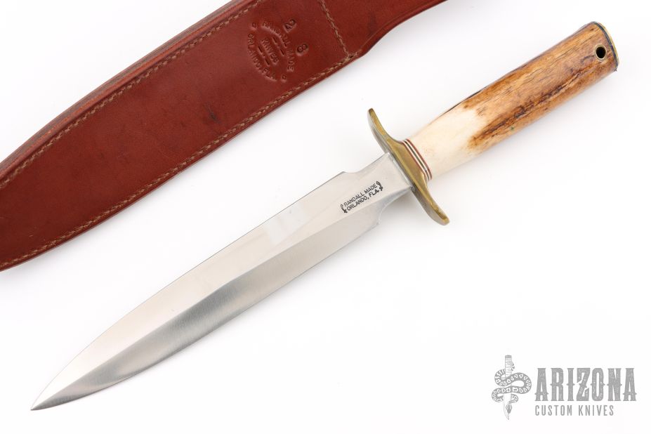 The Model 2-8 by Randall Made Knives is a heavily made dagger or dirk. The handle has a brass guard, stag grip, brass butt plate, red/white/blue spacers. Double-edged satin finished blade, .219" blade stock and 1.218" blade depth, hidden tang construction. Comes with a brown leather Randall sheath. Excellent condition.