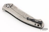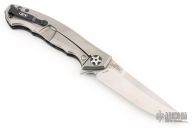 This 0452CF Sinkevich designed folder from Zero Tolerance features a drop point blade with swedge. The blade has tumble finished flats and satin grinds. The handle has a carbon fiber scale on the non lock side, and a tumbled finish titanium frame lock on the other. Serial #32884. Excellent condition. Comes with original box and papers.
