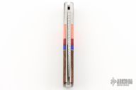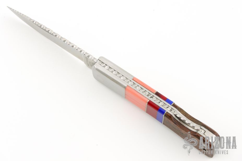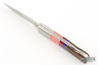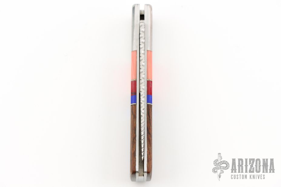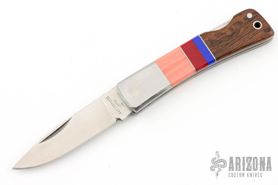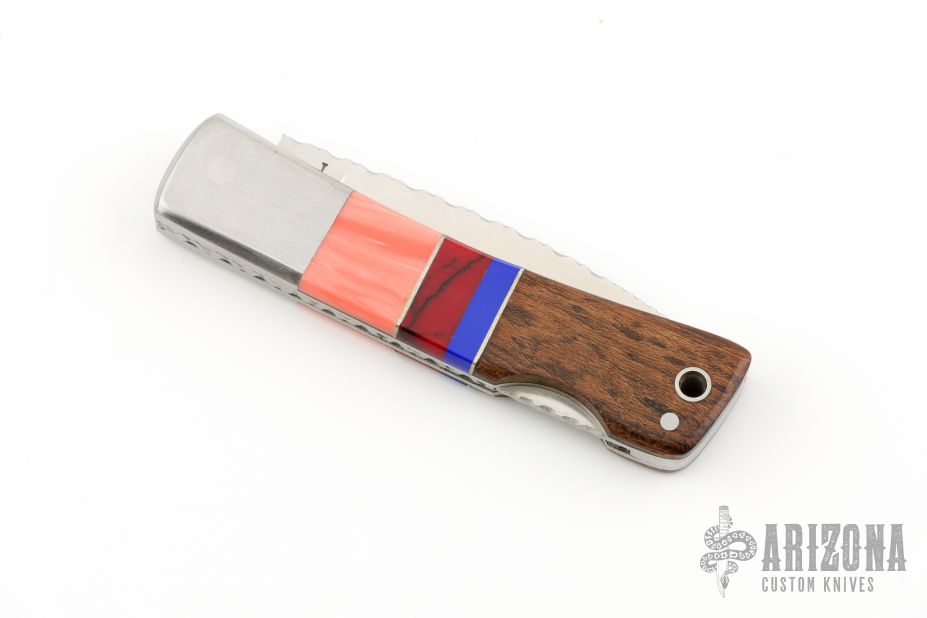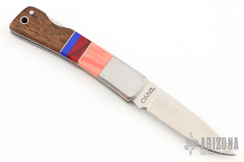 This lockback by Taiyo has been customized by Ken Metsala. It features a satin polished blade with nail nick. The handle features satin stainless bolsters and mosaic overlay with stainless liners and stainless steel spring. Blade spine and rockerbar have been file worked. Has some light scuffs, excellent condition otherwise.