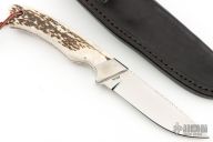 This hunter from Ferenc Tumpek features a mirror polished blade with fileworked spine and notched thumbrest, .151" blade stock and .955" blade depth, full tapered tang construction. The handle has nickel silver bolsters and stag scales with stainless pins over red liners, fileworked tang, lanyard hole at the butt. Comes with a black leather sheath. Excellent condition.