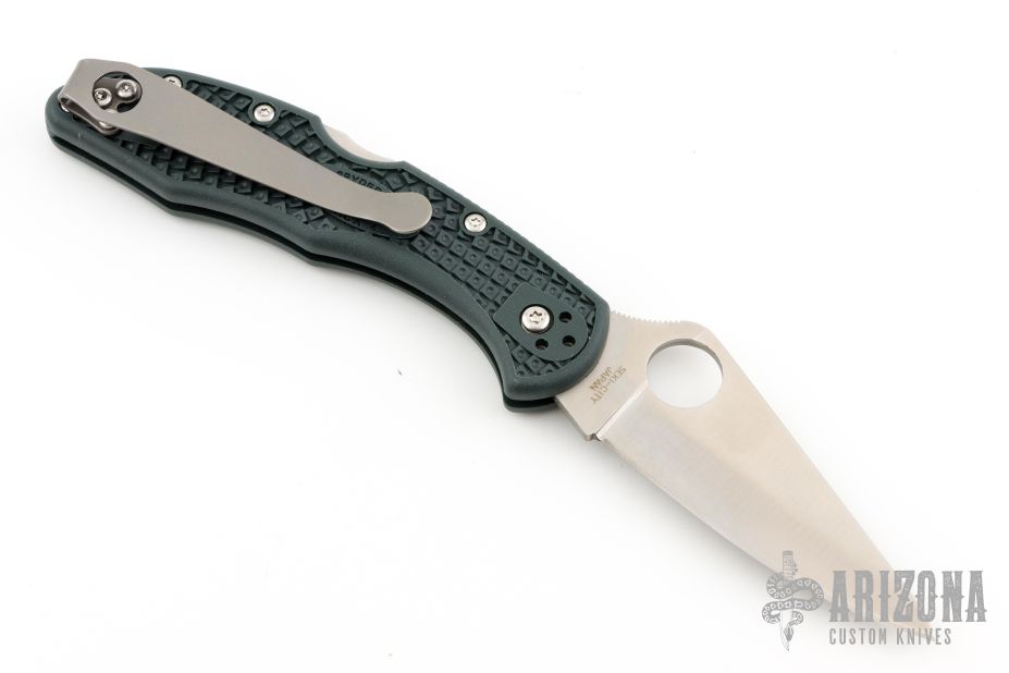 The blade on this Delica is ZDP-189, a powdered metal made by Hitachi that has phenomenal chemistry with 3% carbon. The hardness is around 64RC and edge retention is exceptional. The blade features spine jimping that extends from the ramp to the top of the handle. The Spyderco original thumb hole on the blade allows ambidextrous one-hand opening for right or left handers and the phosphor bronze washers at the pivot make the blade action smooth. The Delica has a lightweight FRN (fiberglass reinforced nylon) handle with skeletonized stainless steel liners and a strong back lock mechanism. The handle features screw construction for quick, simple cleaning and adjustment. The FRN scales utilize Spyderco's patented Bi-Directional Texturing to keep your hand from slipping under pressure. The pocket clip is 4-way reversible for tip-up/down and left/right carry.