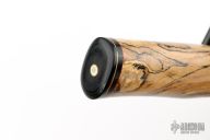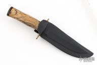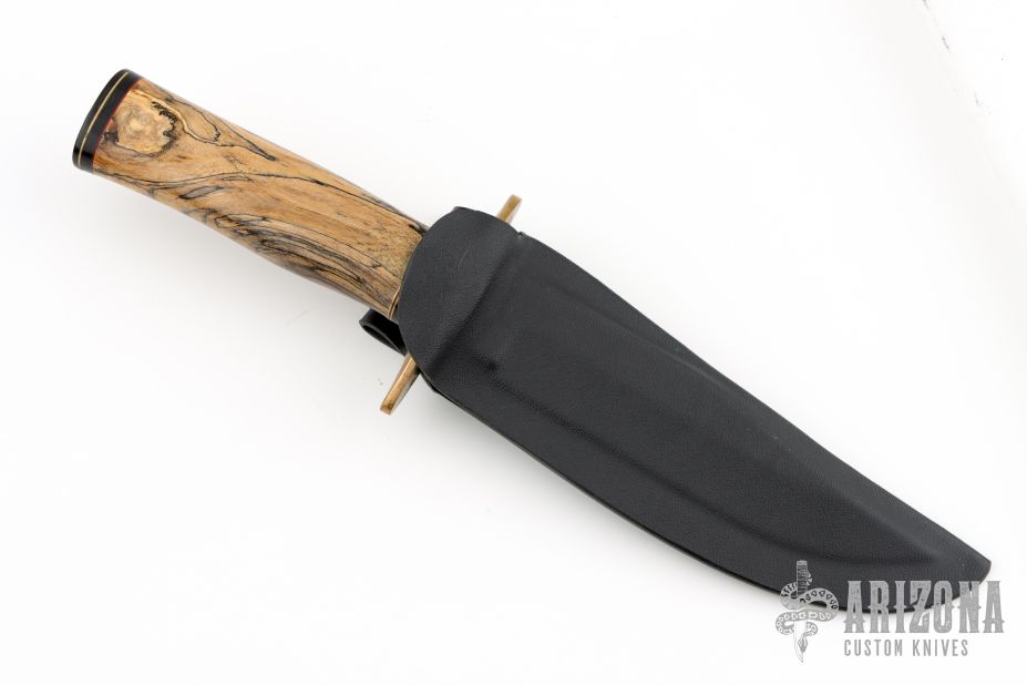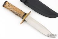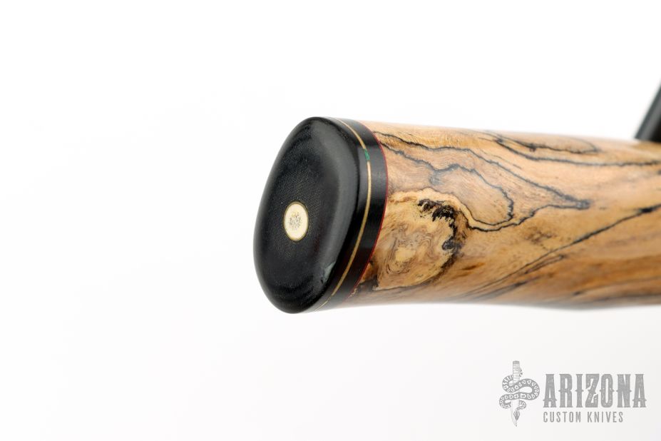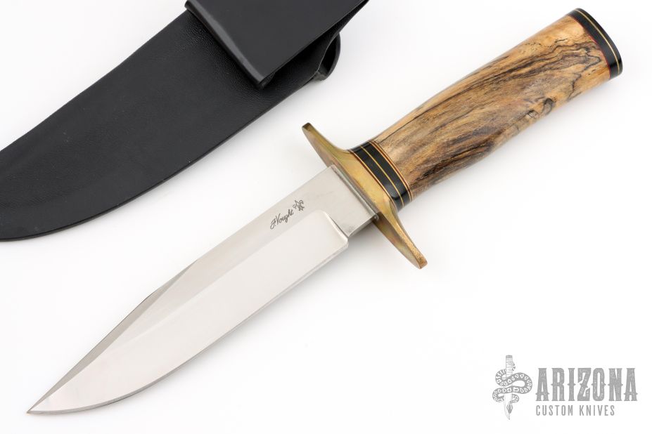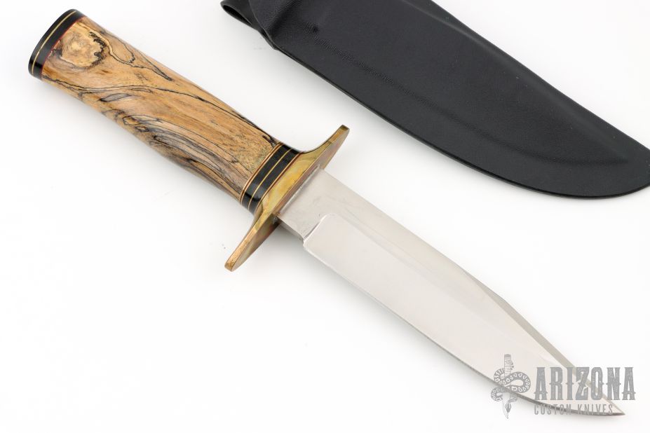 This fighter by Frank Vought Jr features a satin finished blade with a nearly sharpened top edge, .191" blade stock and 1.226" blade depth, hidden tang construction. The handle has a brass guard, spalted wood grip, red/brass/black linen micarta spacers, black linen micarta butt. Comes with a kydex sheath. Has a few light scratches, otherwise excellent condition.