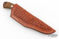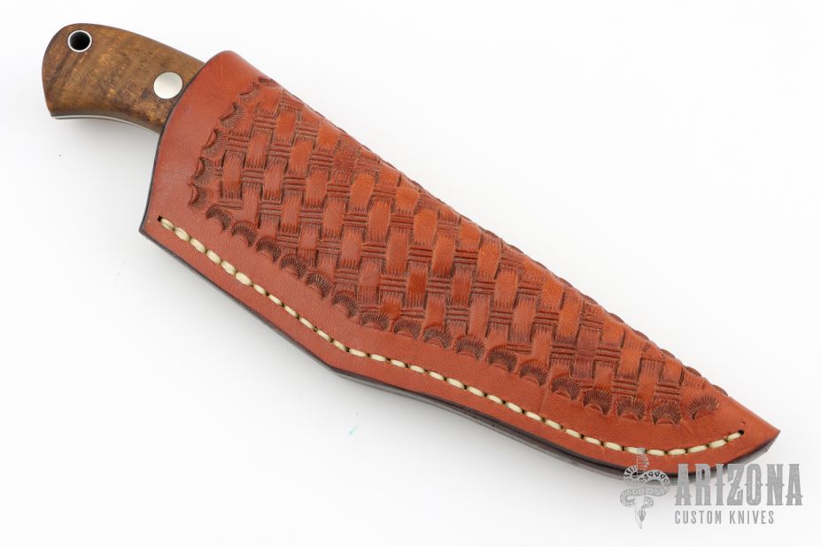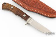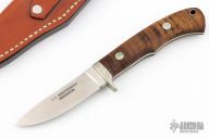This knife by JL Montgomery features a satin finished blade with .153" blade stock and .868" blade depth, full tapered tang construction. The handle has a nickel silver guard and pins, curly wood scales. Comes with a hand tooled brown leather sheath. Has some patina, otherwise excellent condition. #3217 on the tang.