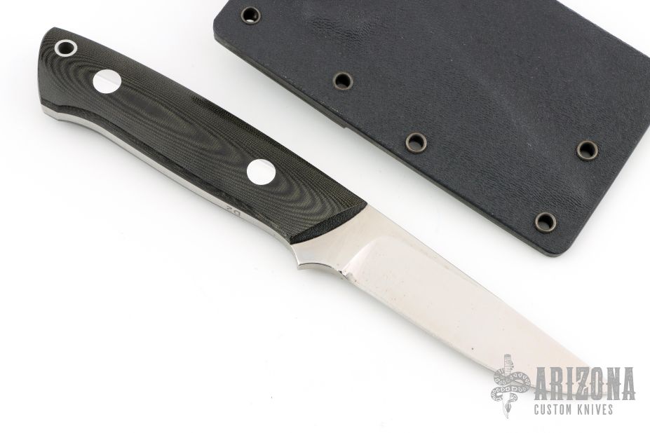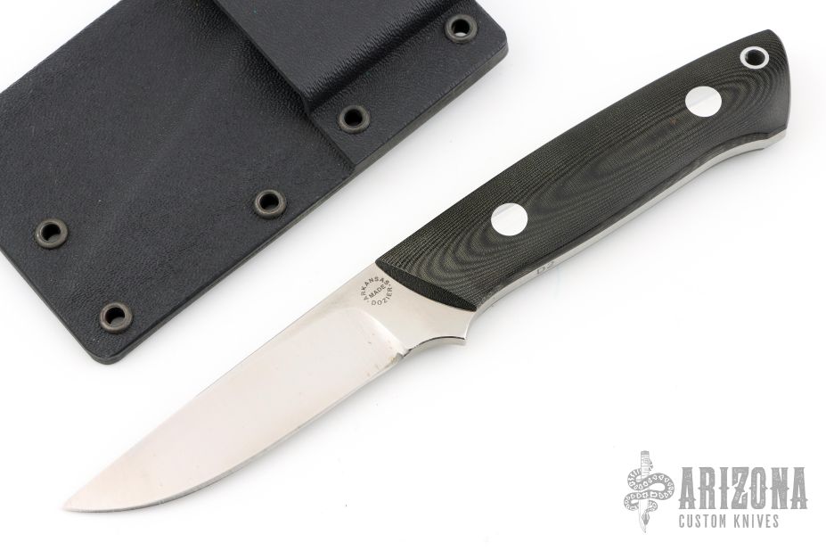 This K-7 Slim Outdoorsman by Dozier Knives features a satin finished blade, .168" blade stock and .848" blade depth, full tang construction. The handle has black linen micarta scales with aluminum pins and lanyard hole. Comes with kydex sheath with belt clip. Has a small spot on the blade, otherwise excellent condition.