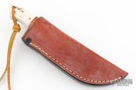 This Hunter by Ed Jones features a mirror polished blade with .141" blade stock and .978" blade depth, full tapered tang construction. The handle has a brass guard, wood and stag scales and red spacers. Comes with a brown leather sheath. Has some patina on the guard, otherwise excellent condition.