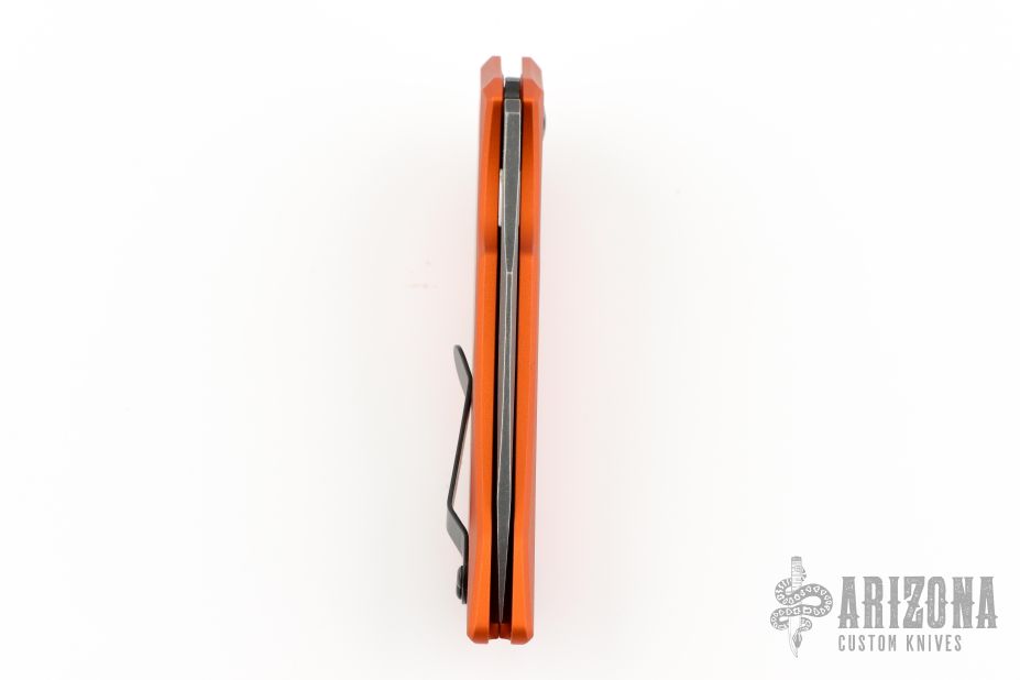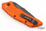 This Launch Auto #1 by Kershaw features a blackwash finished blade with swedge. The handle is orange aluminum with push button and tip up reversible black stainless steel clip, lanyard hole at the butt. Excellent condition. Comes with original box and papers.