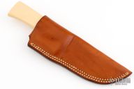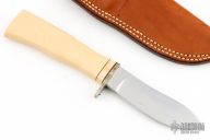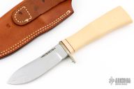 This knife by Morseth features a satin finished laminated steel blade, .172" blade stock and 1.067" blade depth, hidden tang construction. The handle has a nickel silver guard, ivory paper micarta grip and black/brass spacers. Comes with a brown leather sheath. Has some patina on the blade, otherwise excellent condition.