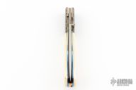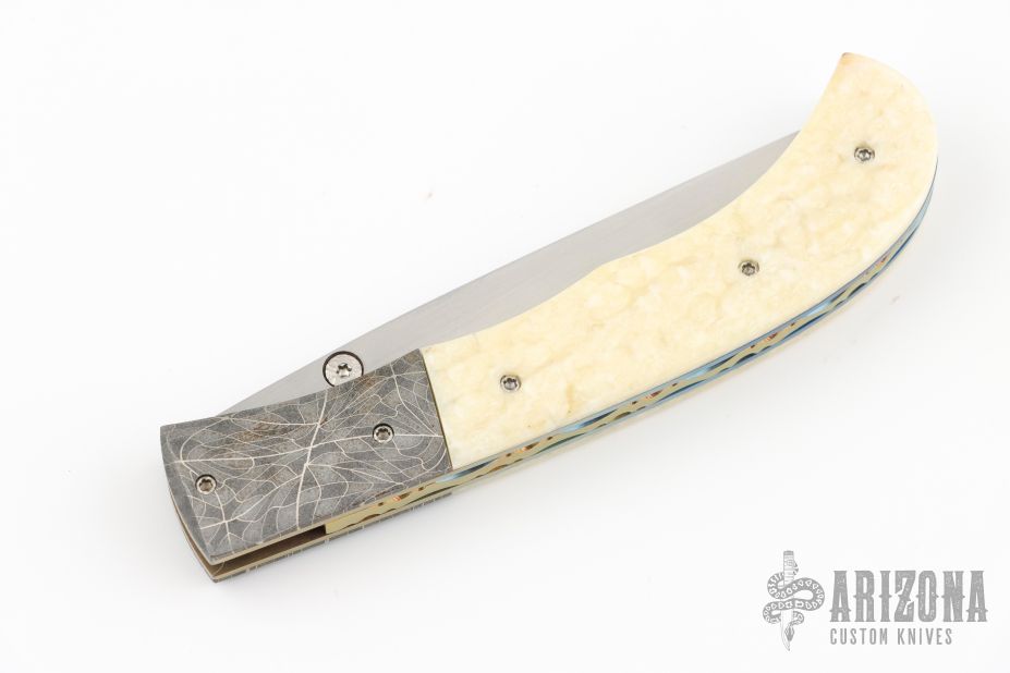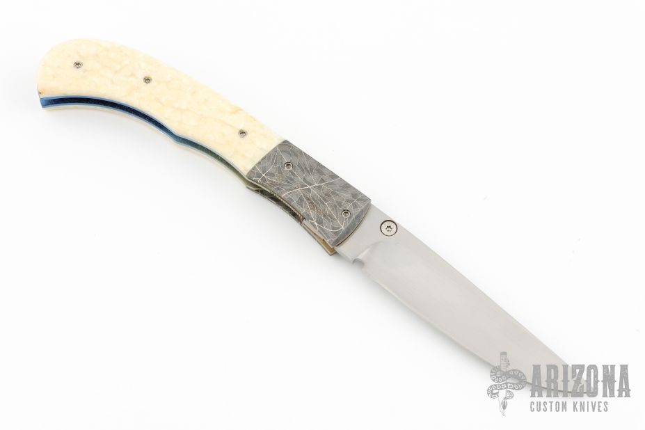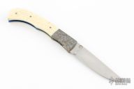 This linerlock folder by Robert Capdepon features a hand rub satin finished blade with single red stone inlaid thumbstud. The handle has mosaic Damascus bolsters, walrus ivory scales, anodized titanium liners, fileworked and anodized titanium backspacer. Nice detent and blade seating. Has some very minor lockrock, otherwise excellent condition.