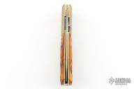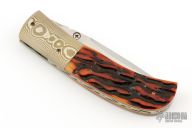 This linerlock folder by Robert Capdepon features a hand rub satin finished blade with fileworked spine and a single black lip pearl inlaid thumbstud. The handle has mokume bolsters, jigged bone scales, anodized titanium liners with jeweled interiors, fileworked and anodized titanium backspacer. Nice detent, lockup and blade seating. Excellent condition. Comes with a zippered case.