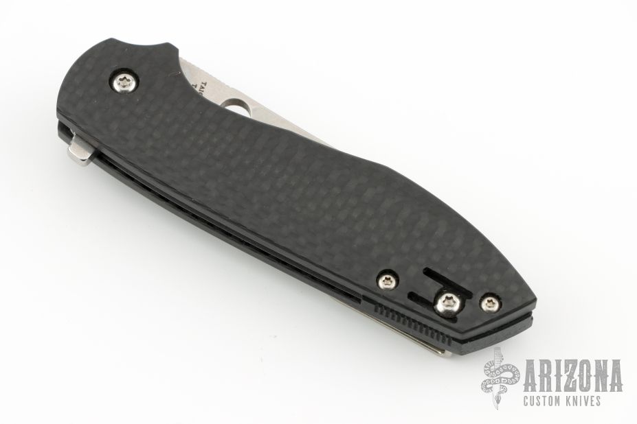 This Positron by Spyderco is a Brad Southard design, it features a tumble finished blade with notched thumbrest, thumbhole and flipper. The handle has a carbon fiber frame, black G-10 backspacer with stainless steel liner and a tip up paper clip style clip, left or right reversible. Comes with original box and papers. Has a couple light scuffs, otherwise excellent condition.