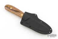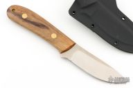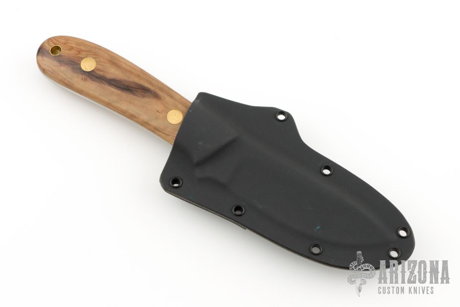 This K-5 King's River Skinner by Dozier Knives features a satin finished blade with .138" blade stock and 1.070" blade depth, full tang construction. The handle has olive wood scales with brass pins and lanyard hole. Comes with kydex sheath with belt clip. Excellent condition.