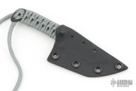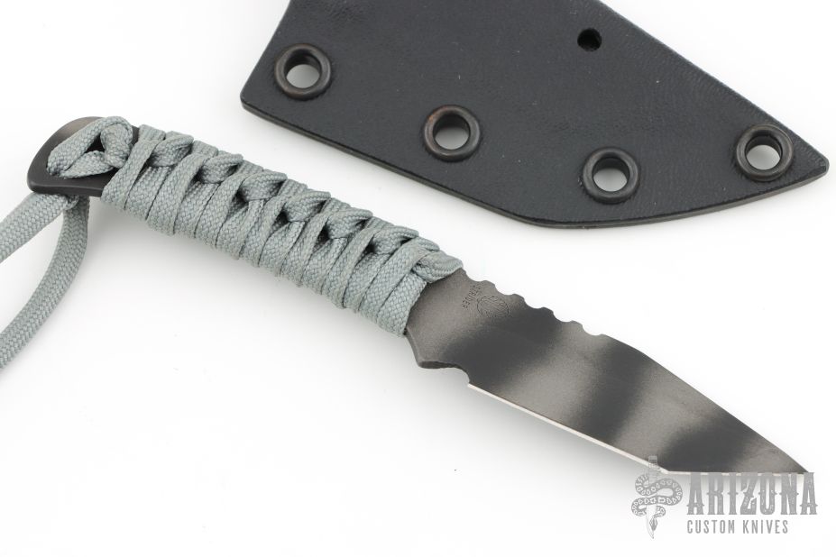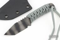 This knife by Mick Strider features a tiger stripe blade with notched thumbrest, paracord wrap, .070" blade stock and .896" blade depth, full tang construction with cord wrapped handle. Comes with kydex sheath. Has some sheath marks, otherwise excellent condition.