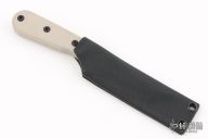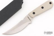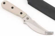 This Persian Steak Knife by Mick Strider features a satin/stonewash finished upswept blade with false top edge and notched thumbrest, .162" blade stock and .950" blade depth, full tang construction. The handle has tan G-10 scales. Comes with a kydex sheath. Excellent condition.