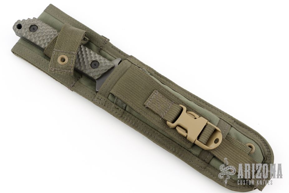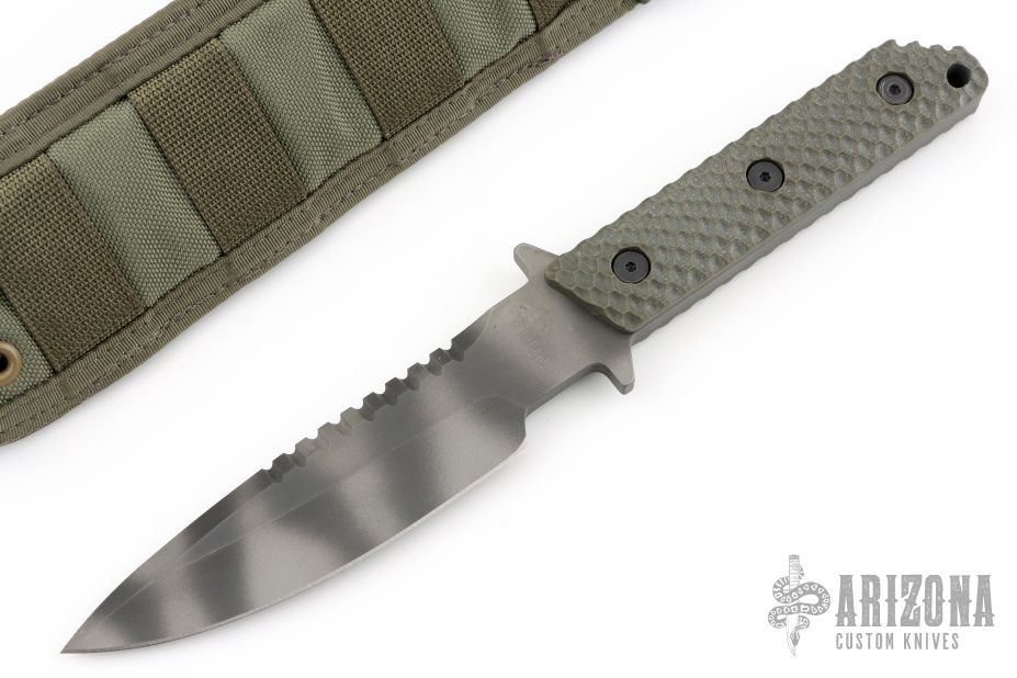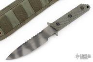 This fixed blade by Strider features a tiger stripe finish blade with full tang construction, .248" bladestock and 1.300" blade depth. The handle has green G-10 gunner grip scales. Includes nylon sheath. Has some light scuffs, otherwise excellent condition.