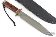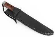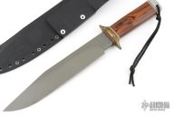 This knife by Allen Blade features a coated blade with radiused spine, .260" blade stock and 1.702" blade depth, hidden tang construction. The handle has brass guard and a fileworked copper habiki, blasted aluminum butt with lanyard hole, cocobolo grip with black/red/white spacers. Comes with a kydex sheath. Has some light scuffs and scratches, has been lightly used, otherwise good condition.