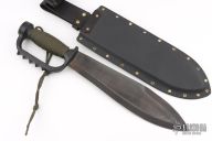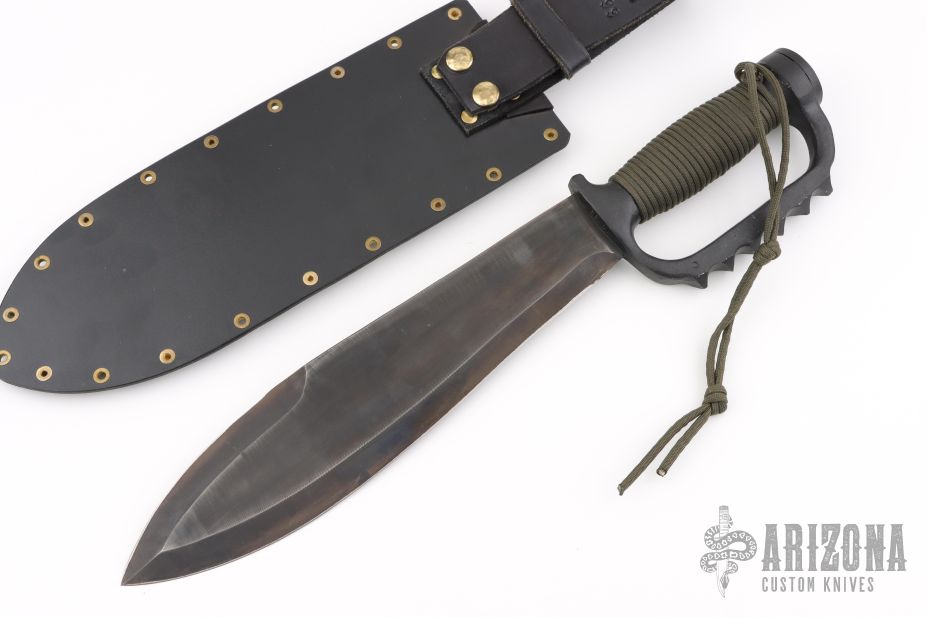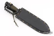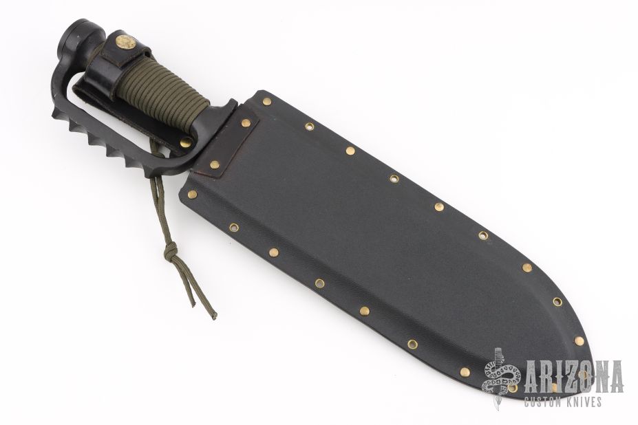 This Fighter by EDMF (Eight Dollar Mountain Foundry) features a black blade with sharpened top edge, .193" blade stock and 2.600" blade depth, hidden tang construction. The handle is cast aluminum, coated black handle with cord wrap. Comes with a kydex sheath with leather belt loop. Has some light scuffs, otherwise excellent condition. This knife is dated 10/99.