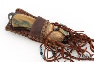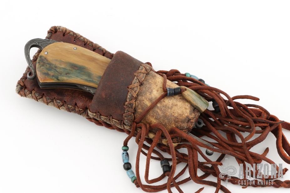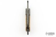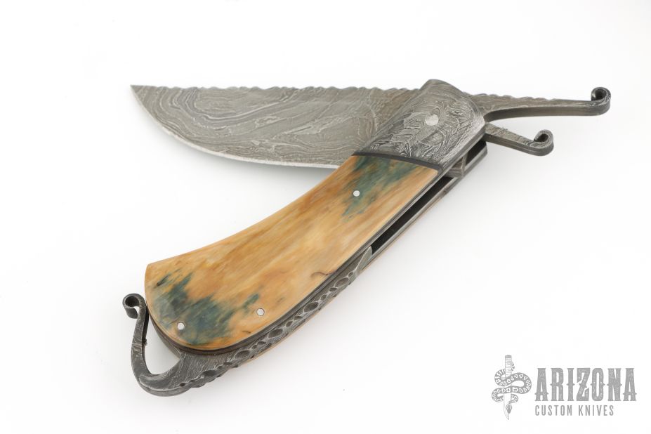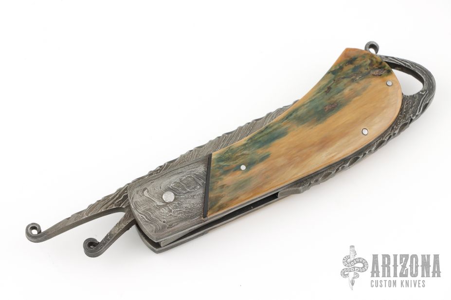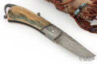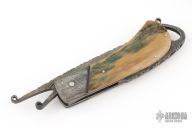 This friction folder by Master Smith Daniel Winkler features a Damascus blade with fileworked spine and decorative friction bar. The handle has Damascus bolsters, mammoth ivory scales, Damascus liners and a fileworked Damascus backspacer. Comes with a rawhide and brown leather neck sheath. Really nice example of Daniel's custom work! Excellent condition.