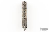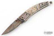 This linerlock folder by Wayne Whittaker features a Blued Damascus blade with single thumbstud with a diamond inset in a gold bezel. The handle has blued mosaic Damascus bolsters, mammoth tooth scales, fileworked titanium liners, fileworked stainless steel backspacer with mammoth tooth inlays. Nice blade seating, detent and lockup. Excellent condition. Comes with a Velcro case.