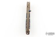 This knife by Frank Niro features a Mosaic Damascus blade with a single thumbstud with black stone inlay. The handle has colored meteorite bolsters, mammoth tooth scales with red liners, anodized and fileworked titanium liners with jeweled interiors and a fileworked stainless steel backspacer with abalone inlays, has gold plated screws. Nice blade seating, detent and lockup. Excellent condition. Comes with a velcro case.