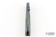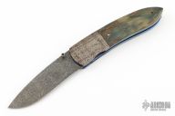 This Model 3 by Andre Van Heerden features a Mosaic Damascus blade with single thumbstud with mammoth ivory inlay. The handle has blued and dovetailed Mosaic Damascus bolsters, mammoth ivory scales, anodized titanium liners, satin finished stainless steel backspacer. Nice detent, lockup and blade seating. Comes with a zippered case. Has a couple very light scratches, otherwise excellent condition. "AVH" on the inside of the backspacer.