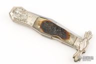This is a large lockback by Parker Cutlery Company features a mirror polished blade with nail nick. The handle has nickel silver bolsters and stag scales, brass liners, stainless steel backspacer. Blade is imprinted with "Vengence Is Mine" #539. Has some light scuffs, scratches, and light rust spots. Great condition otherwise.