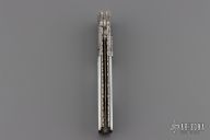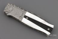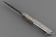 This Automatic Knife by Mel Pardue features a Damascus dagger blade with a sharpened top edge at the tip, has fullers. The handle has fileworked and fluted Damascus bolsters, fileworked Damascus rocker bar, fileworked Damascus backspacer, fileworked and jeweled titanium liners, mammoth ivory and fluted ebony scales. Nice action, lockup and blade seating. Comes with a zippered case. Excellent condition.