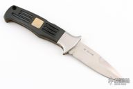 This AL MAR SERE Tactical Folding Knife features a satin finished spear point blade with a nail nick. The handle has stainless steel bolsters, textured black Neoprene with the RARE and limited GOLD Al Mar Chop inlaid on both sides, brass liners, stainless steel spring and backspacer, lanyard hole. Pre Production 057/200. Comes with original camo covered black leather sheath. Has some scuffs and scratches, great condition otherwise.