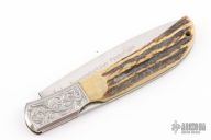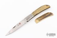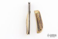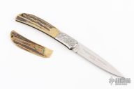 This Eagle by Al Mar features a satin finished blade with nail nick. The handle has engraved stainless steel bolsters, stag scales with a stainless steel backspacer. Comes in an Al Mar leather belt sheath. Scale on the show side comes off and the knife could use a little TLC.  Has some light scratches, otherwise good condition.