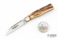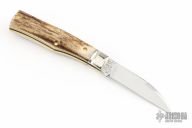 This slipjoint by Northfield features a mirror finished blade with nail nick. The handle has fluted nickel silver bolsters, brass liners, Sambar Stag covers, steel spring. Has half-stop, flush in all positions. Comes with original packaging. Excellent condition.