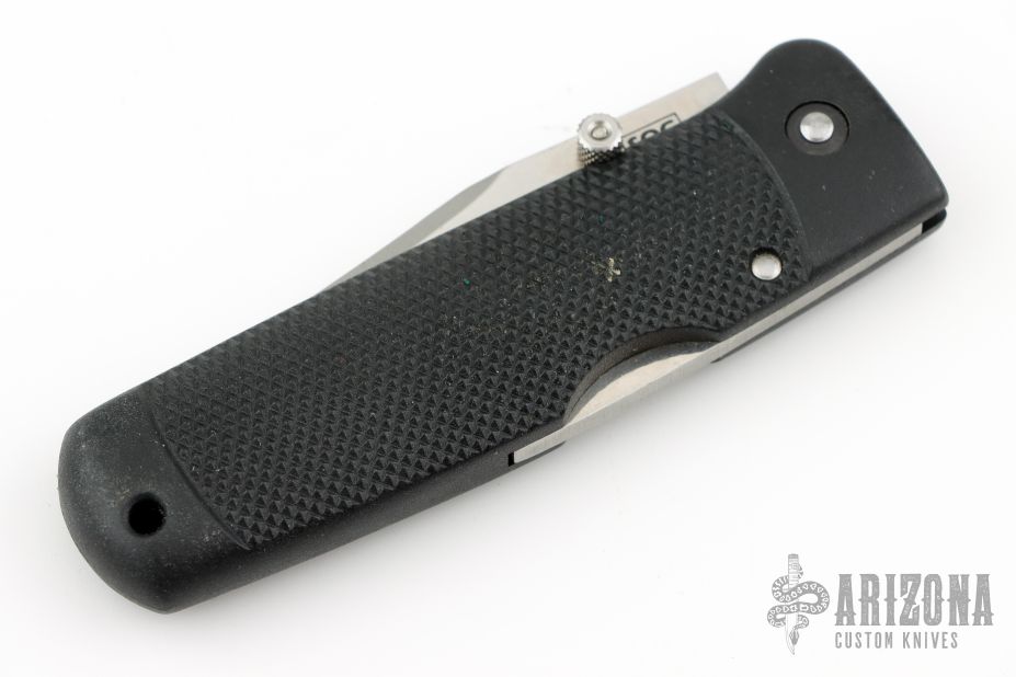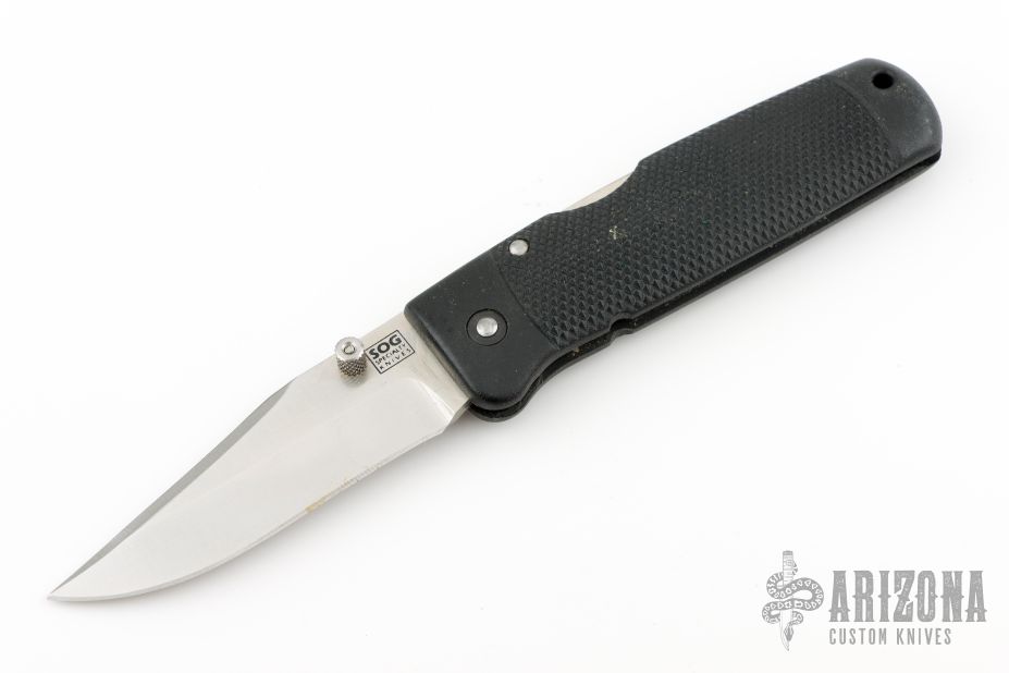 This S16 Air SOG lock back by SOG features a satin finish blade with false top edge and single thumbstud. The handle has a black kraton scales with a stainless steel lock. Strong lock up. Has scuffs and scratches, good condition otherwise.