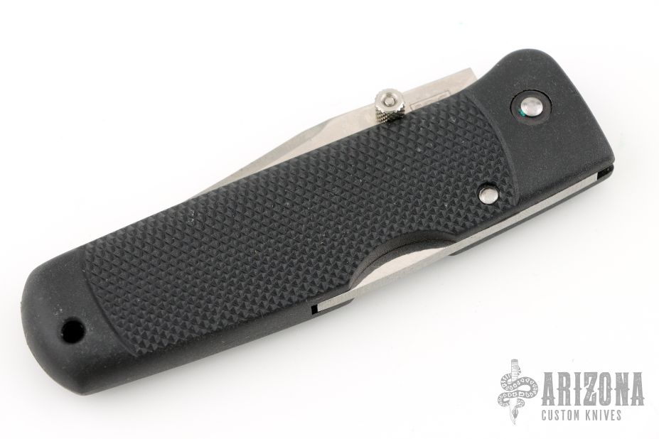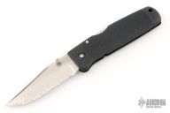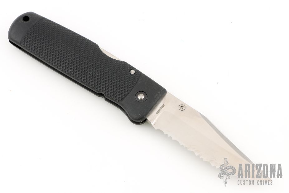 This Air SOG lock back by SOG features a satin finish blade with false top edge, serrated edge, and single thumbstud. The handle has a black kraton scales with a stainless steel lock. Strong lock up. Has scuffs and scratches, good condition otherwise.
