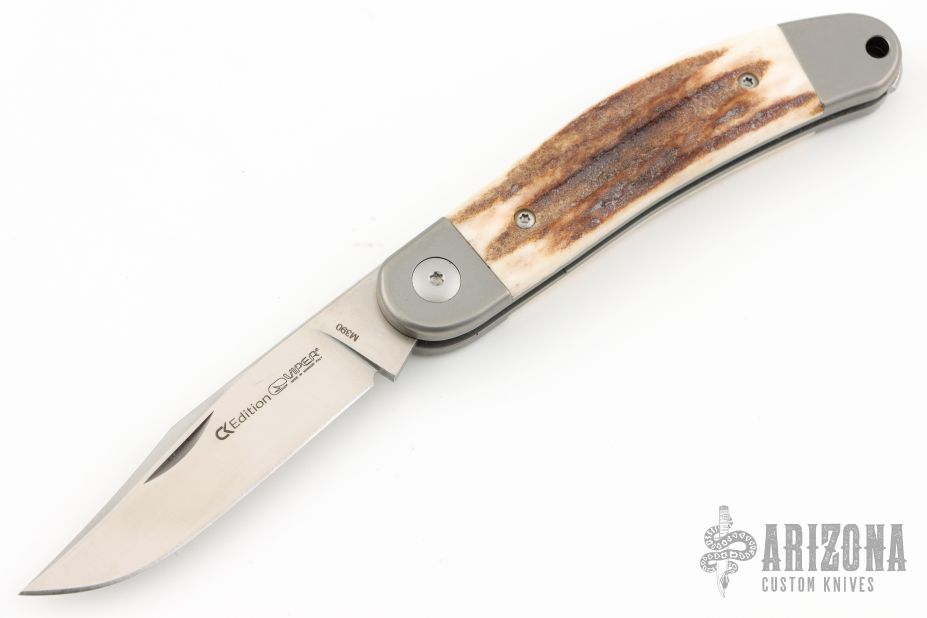 This is the Viper Knives Sowbelly, has Stag handles and Titanium liners. The blade steel is M390 and finish is Satin.