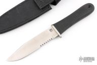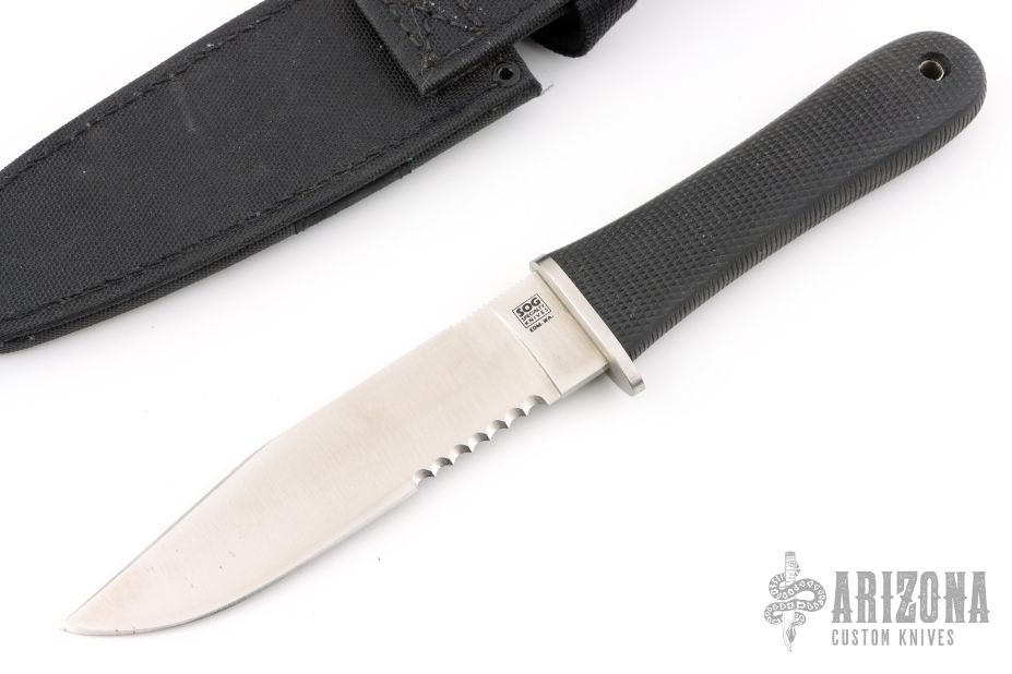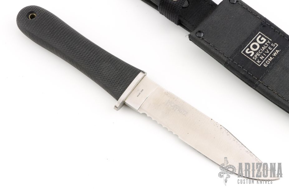 This Sog Knife features a satin finished clip point blade with notched thumbrest, and partial serrations. The handle has a steel guard, and checkered rubber grip with lanyard hole. Hidden tang construction with .154" blade stock, 1.116" blade depth. Comes with a Sog nylon belt sheath. Has some light scuffs, scratches, as well as some light oxidation on the blade. Great condition otherwise.