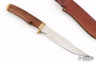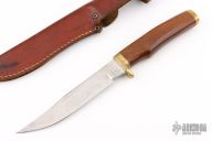 This knife by Robert Hajovsky of "Bob Sky" knives features a mirror polished blade. 0.177" blade stock and .938" blade depth. The handle is comprised of a brass guard/butt and wood grip. Signed/numbered/dated in the Picasso "2-76-6". Comes with leather sheath. Has scuffs, scratches, and patina. Good condition for its age.